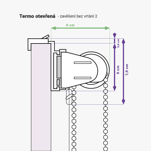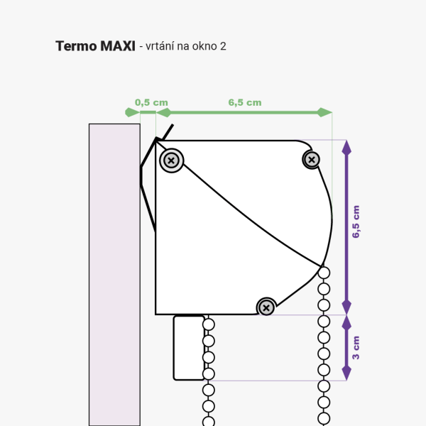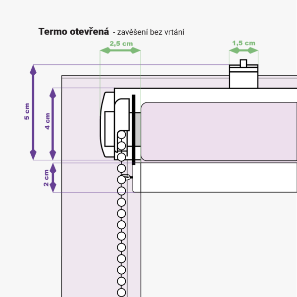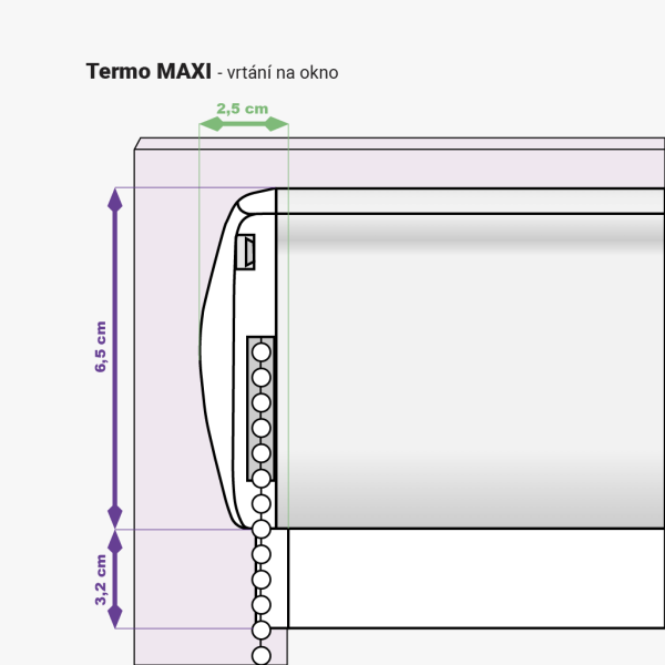 Termo rolety nabízíme ve variantách kazet otevřená, POLO a MAXI. Vyrábíme je v délce 150 cm, 220 cm a v šířce 30 cm až 210 cm. Roletu dodáváme včetně mechanismu pro ovládání řetízku o délce 1 m nebo 1,5 m a kompletní sady pro upevnění. Rolety jsou již složené a mají několik variant provedení montáže. Můžete je připevnit zavěšením - bez vrtání nebo přivrtat do okenního rámu, do zdi či do stropu.